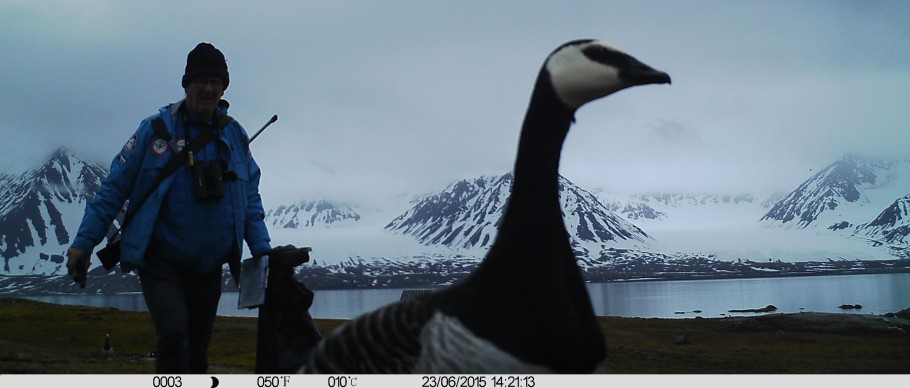 Margje has placed wildlife cameras on some of the nests to study the effect of fleas on incubation behaviour. I was caught by one of these cameras. | |