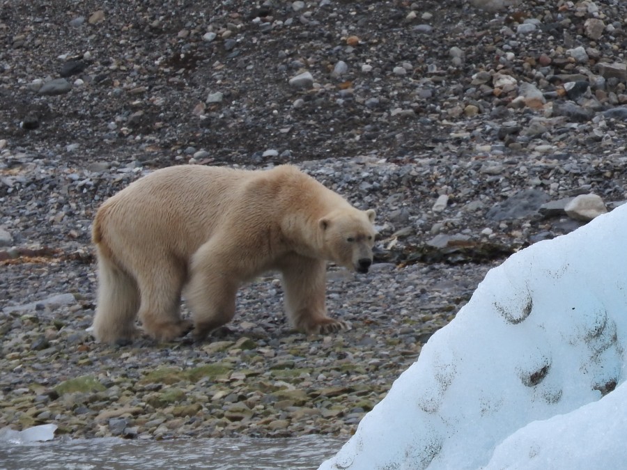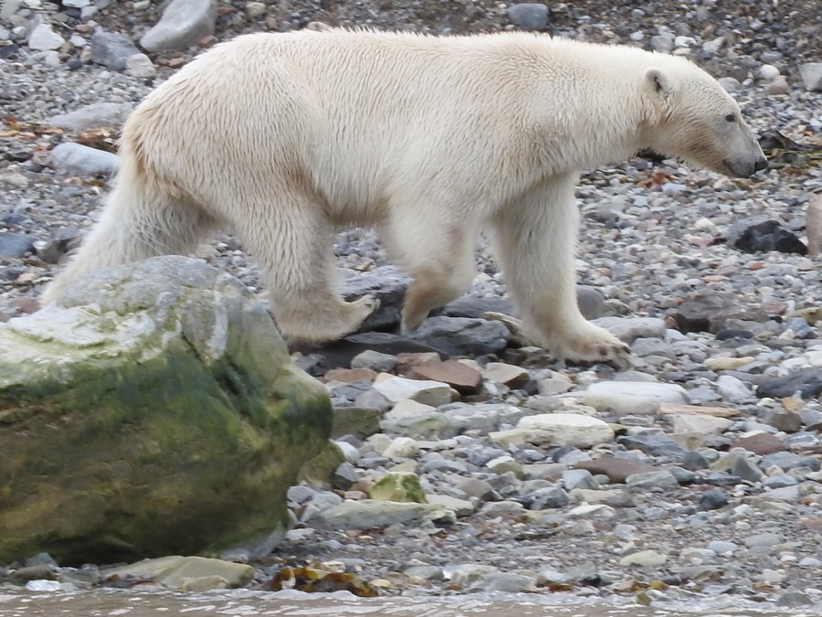 | We zijn op weg om ruiende ganzen te tellen, maar komen in een stukje van 2 kilometer kustlijn 3 ijsberen tegen. We waarschuwen een Koreaans en Chinees team en brengen twee wandelaars dichter naar het dorp. De ijsberen lopen trouwens alle drie in de richting van het dorp en twee zijn er al zwemmend gepasseerd als we thuis komen. | |