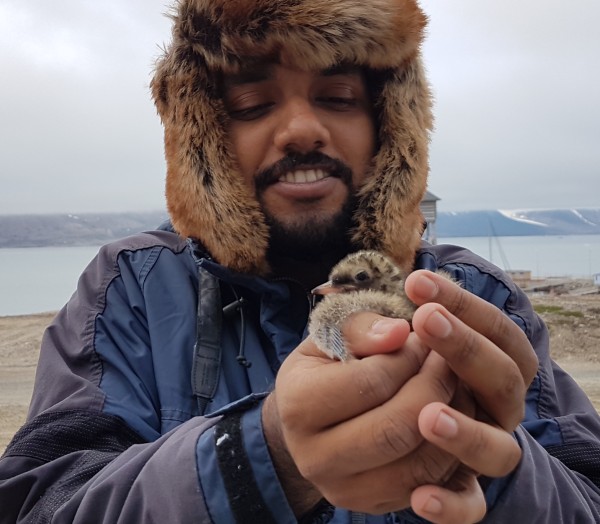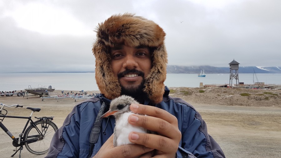 The only arctic tern chicks surviving in the village are breeding in a fenced area around the oil drums. I have ringed in this area 25 chicks and I am weighing them once more to follow their growth. Today Jabir Thajudeen from the Indian Himadri station is joining us and hopes to collect some fresh faeces from adults. This is also a good opportunity to take a picture from him with a chick. |