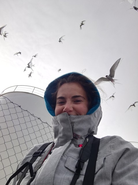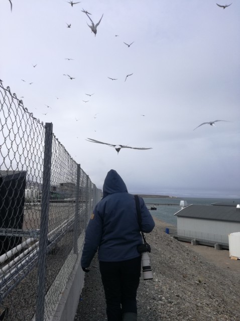 | Rond de olietanks staat een hek en we hebben gezorgd dat er geen poolvos binnen kan komen. Terwijl buiten het dorp alle stenennesten zijn gepredeerd hebben we 70 nesten binnen de omheining. Dat is dus prachtig, hoewel onderzoek aan sternen hier niet altijd gemakkelijk is met hun aanvallen, geschreeuw en gepoep. Petra Manche houdt alles bij en Marlon de Haan helpt. | |