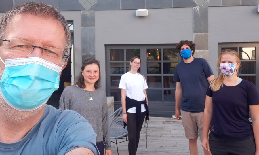 Vandaag is de rest van het eerste team gearriveerd. Van links naar rechts: Maarten Loonen, Catharina Uth, Tessa Viglezio, Rienk Fokkema en Margje de Jong. Maarten en Margje vliegen morgen door naar Ny-Ålesund. Tessa, Catharina and Rienk blijven nog 10 dagen in het hotel in quarantine in this hotel. Isabella Scheiber komt een maand later en neemt de plek van Rienk over. | |