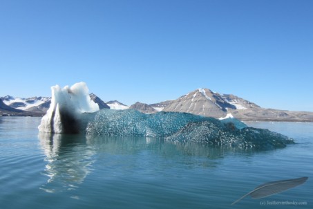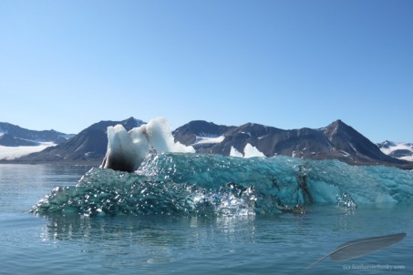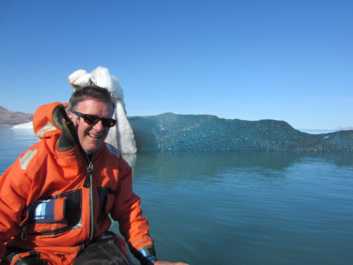 experiencing arctic loneliness. He survived well. On the way home, we pass an ice berg which has just fallen over. Nice blue of compressed ice now floating on top. |