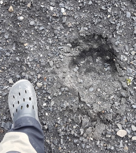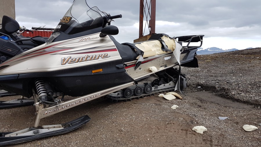 | This morning, a bear visited town. At 7:30 it was seen passing mellageret and going along the shore. Later during breakfast it was out of sight on Prins Heinrichsøya. After breakfast it swam to the shore and moved inland. Later today we discovered some damage near the old powerstation. The bear had destroyed a cushion of a snowmobile. I found some tracks closeby. | |