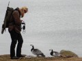 | Later that day, we observed it once more from further distance. The effect is clear. There are this year very few eider nests on Storholmen. The geese are able to chase the reindeer away from their nests. We saw a male running after a reindeer, which speeded away. Later we saw a direct conflict with a goose jumping up into the reindeer face and the reindeer jumping to hindleggs in a reaction. So the number of goose nests is normal and high. | |