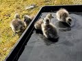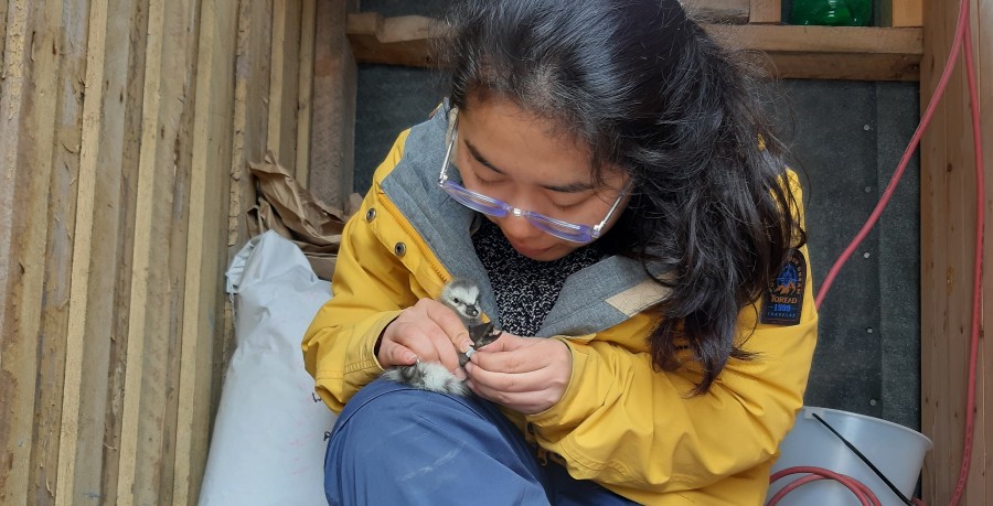 | Biyao Han geeft de kuikens een gekleurd apeje om de poot en gaat daarna met ze buiten wandelen. Aan het eind van de wandeling mogen ze even in water poedelen. | |