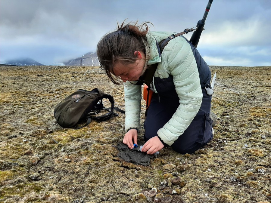 Kristle bemonstert peop van predatoren om met DNA-technieken te kijken of ze ook noordse sternen eieren hebben gegeten. Op Storholmen heeft ze verse ijsbeerpoep gevonden. | |