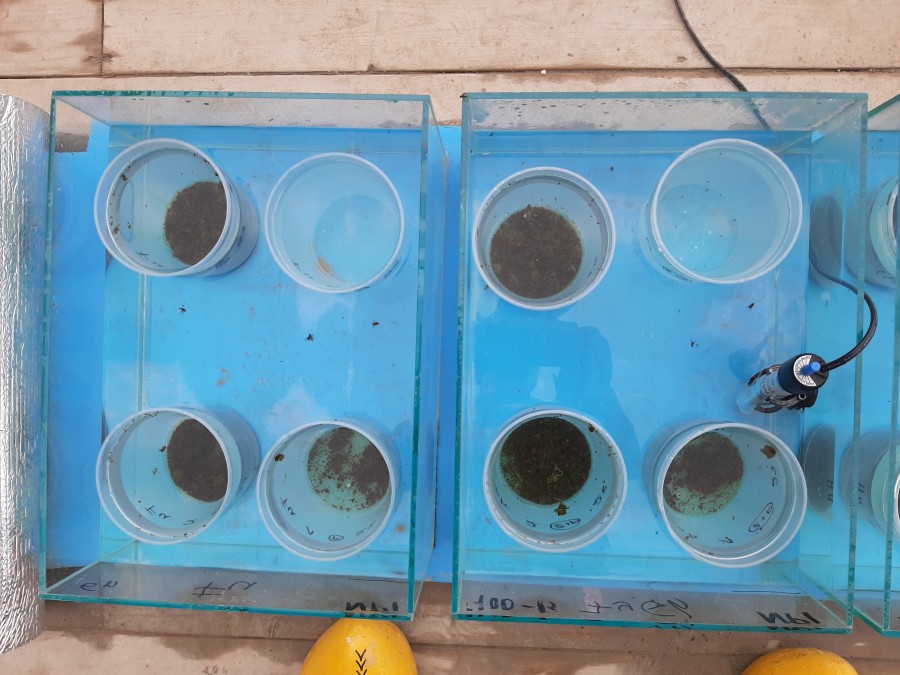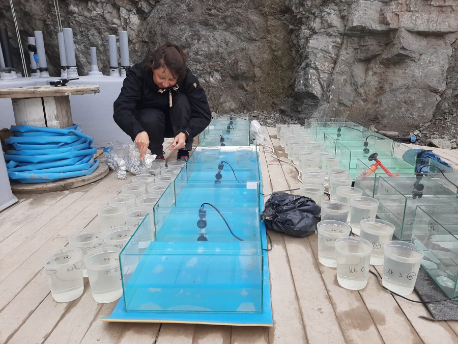 | We started so nicely with our aquarium experiment by adding 0, 1, 2 or 3 droppings to mesocosms with Daphnia in heated and unheated aquaria. But after three days, the Daphnia died and the pots became smelly. We expect the droppings, collected at the Sagbruk area but maybe containing some pollution like coal. That is why we restarted the experiment and Catharina is filling the pots with the same amount of droppings collected close to Solvatnet. | |