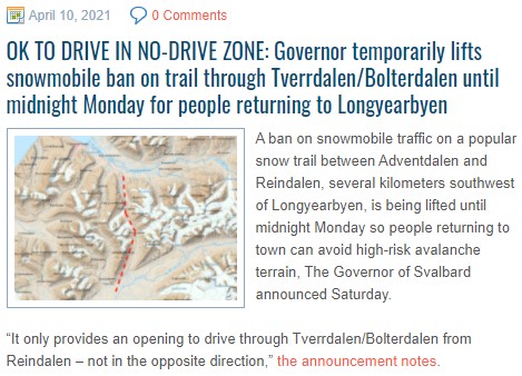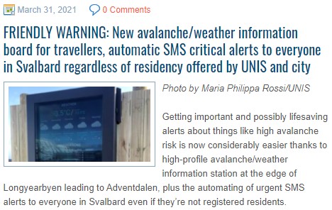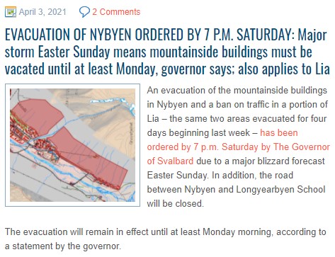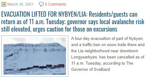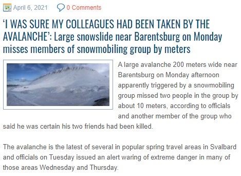 In Longyearbyen, the past two weeks there has been a serious avalanche danger. The English language newspaper icepeople.net reported daily on the developments. It was code red on 11 and 11 April and code orange on 12 April. Normally this is the snowscooter season, with a lot of outdoor activity. But now people had to stay inside. The amount of avalanches is increasing in recent years and is a consequence of climate change. Especially rain events in winter, which did not happen so much before in this area with desert amount of precipitation, now causes avalanches and landslides. The whole village of Longyearbyen is rebuild after the first avalanche which killed two people and destroyed a whole street. Note the dates on the pages in icepeople.net. They are all in the last two weeks only. You can read all the pages at the free website of the newspaper. | |