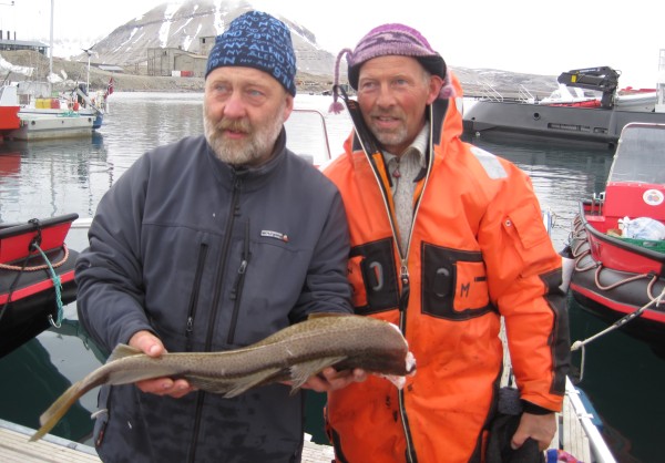 Returning from Storholmen, we meet Wojtek Moskal and Leif Arild Håhjem in the harbour, back from a fishing trip. Steinar had discovered the presence of a lot of cod west of Blomstranden ona depth of 20-40 meter. Within an hour they have caught 40 fishes. Cod is a special fish. It is economically very important. In relative warm seasons they can move north. This year seems to be such a year. The water temperature in the top layer is 6.8 degrees Celsius. The stomachs were full of shrimps. When there is a low food availability for cods they can become predators of their own kin. The presence of this cod is not simply good news. The fast ice is far away. This must be seen as a sign of global warming. At this moment, we are still heading to a new record low in ice coverage http://nsidc.org/arcticseaicenews/, beating the previous record of 2007. |