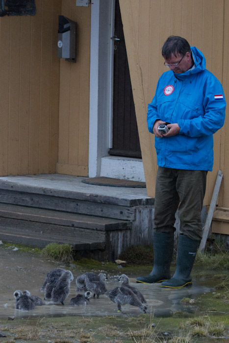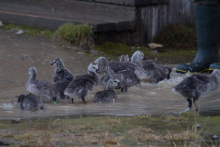 | Na een hele dag de kuikens verzorgd te hebben, heeft Margje even tijd voor haar zelf en moet ik aan de bak. Al snel zijn we allemaal nat in de regen. Het ziet er een beetje troosteloos uit, maar we hebben alle 11 grote lol. | |