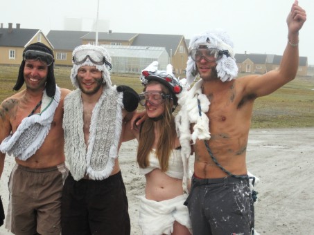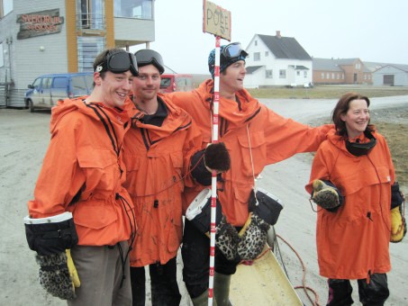 ![]() | The Britsish NerC base has organised a competition for their first time arctic researchers. It is a Race for the pole. Wojtek is the only Polish person from Polish and he must be chased. Two teams run with a cart and a womon on top. The savages win from the oranges. |