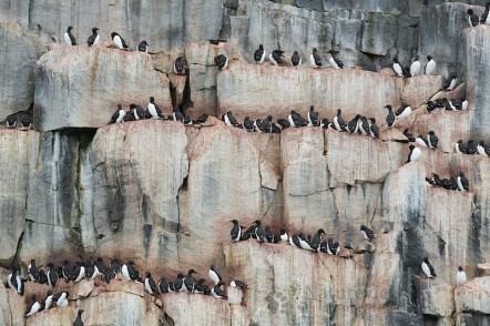 a video from Animal Planet show the dramatic jump. Since 1943, there has been a dramatic increase in goose numbers on Spitsbergen. A 150 times increase due to better food in winter and conservation measures like a hunting ban and nature reserves. To accommodate this population increase, barnacle geese started breeding on small islands. These islands were most often not visited by polar foxes and breeding was safe. Also in Kongsfjorden, the islands in the fjord were populated with barnacle geese since 1982 and the nesting numbers increased to 680 in 2013. In recent years, thanks to a study of Jouke Prop, we learned that the it was only a few decades that islands were safe for nesting as a new predator appearred on stage: the polar bear. In summer, it had disappeared from the west coast of Spitsbergen due to heavy hunting. But since 2000, it has become a regular visitor again. We are still unable to distinguish between three different causes. The hunting ban since 1968 might have supported a population increase. Or the bears might have become less shy for people and tourists. Or the bears are stuck on land because the ice is moving further away in summer. Despite all stories about climate change and scientific and public attention for the fate of polar bears,local scientists are unable to make statements about the importance of each of these three hypothesis. Nevertheless, at this moment most barnacle geese on Spitsbergen are nesting on small island and at least these birds escape the danger of base-jumping. However cliff nesting is not always safe against polar bears as shown here. | |