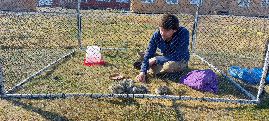 | Nico is keeping an eye on the imprinting. The first couple of days in life, the goslings will learn who their parents are and will follow them the rest of the year. That is why the researchers are sitting with the goslings as much time as possible. | |