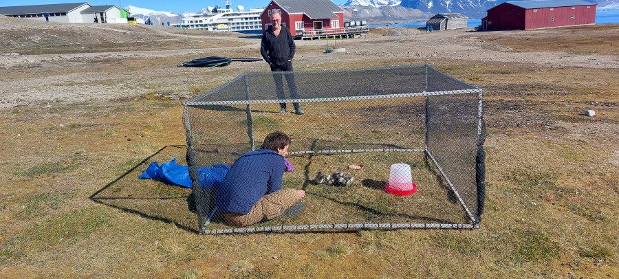 Nico van den Brink has planned a new experiment to study the effect of mercury on behaviour and the immune system of barnacle goose goslings. We had permission to collect 16 newborn goslings and we have done this yesterday. Hatching was late this year. Today we are imprinting the goslings to the two PhD students who will do the analysis. | |
