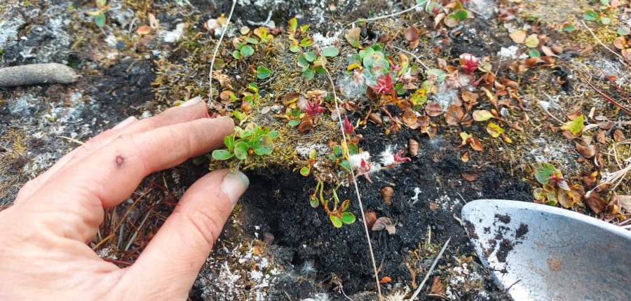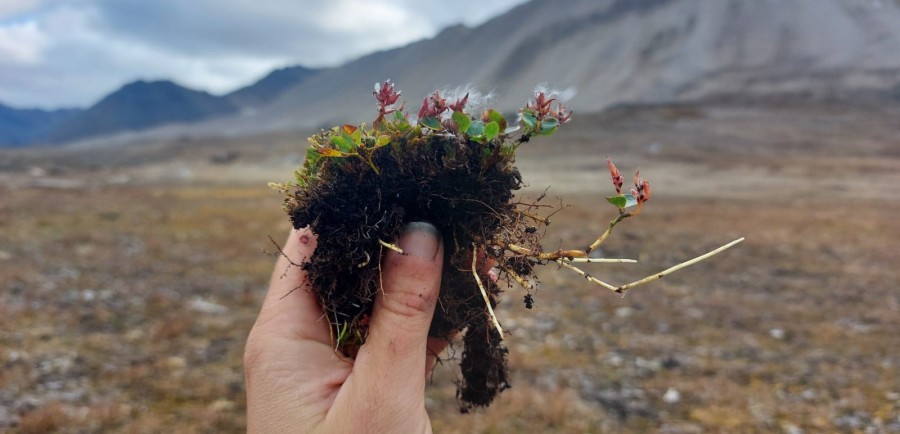 I carefully dig out a shrub and take samples of the branches, roots and root collar (the transition between the root and branch system). This way, I hope to find the oldest part of the shrub with the most tree rings (the root collar), but also have samples of younger shoots that clearly show the rings of the past few years. The reason I need to see these is that the polar willows are sampled from an experimental site where we artificially supplied extra rain in 2022 and 2023. Now I would like to know how that has affected wood growth and wood characteristics.