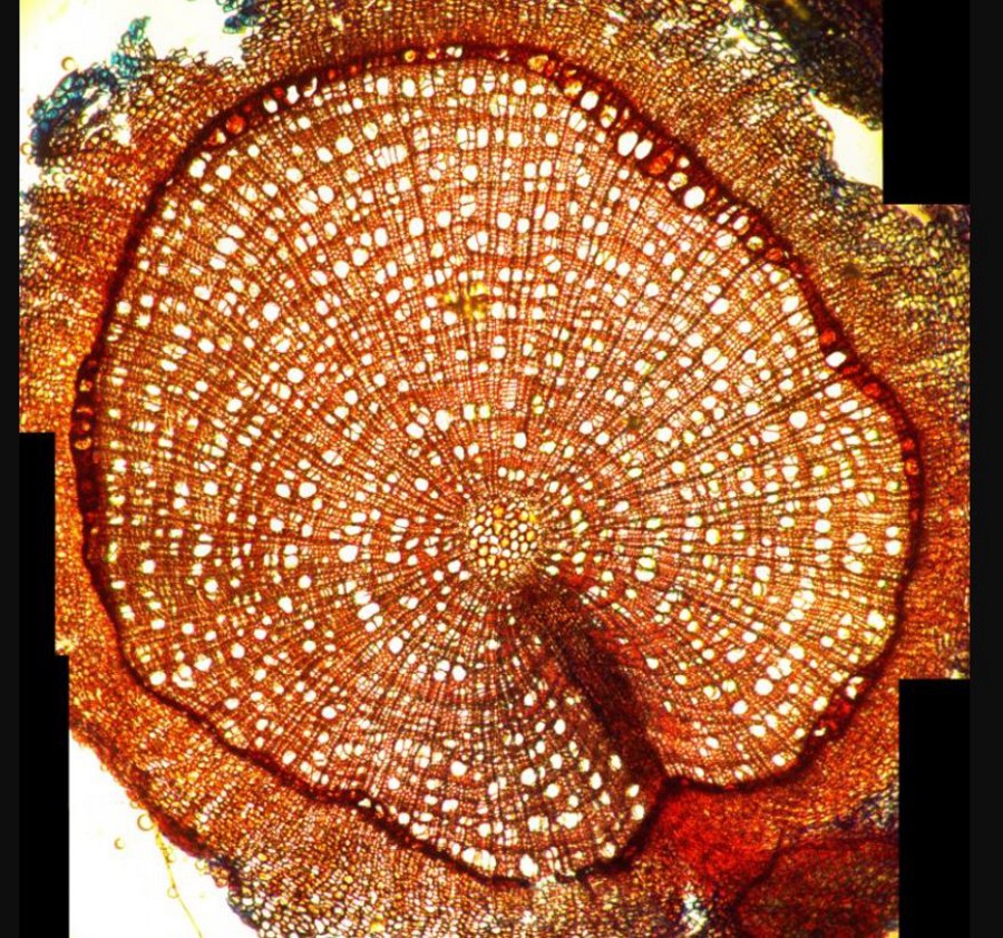 Microscope photo of a cross section of a Salix polaris branch. In the middle you can see the pith, surrounded by tree rings. The tree rings are indicated by a kind of darker line at the end, and large, white wood vessels at the beginning. You can see that the rings are sometimes partially missing. How many rings do you count?