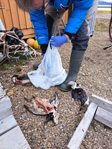 Hans Verdaat found for dead murres floating in the fjord. There were also soime other birds which behaved like being infected by acvian influenza. Hans collected the dead bodies for Maarten to sample. In a project with Erasmus Rotterdam (Thijs Kuijken), Wageningen Marine Research and the Arctic Centre of the University of Groningen, we are sampling birds for avian influenza research. The project is called "Polarflu". In the video to the left Karein filed the sampling.