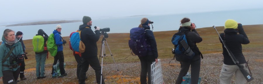 We pack our stuff and gather on the top of the central hill, furthest away from the coast. Only the mother climbs up on the coast. We decided to make a lot of noise, hoping that the bear will leave. Click on the video up from this text to hear us. |