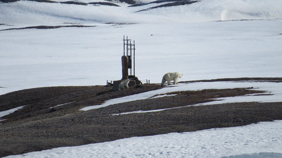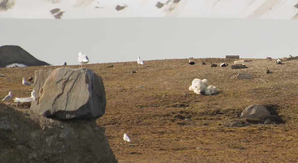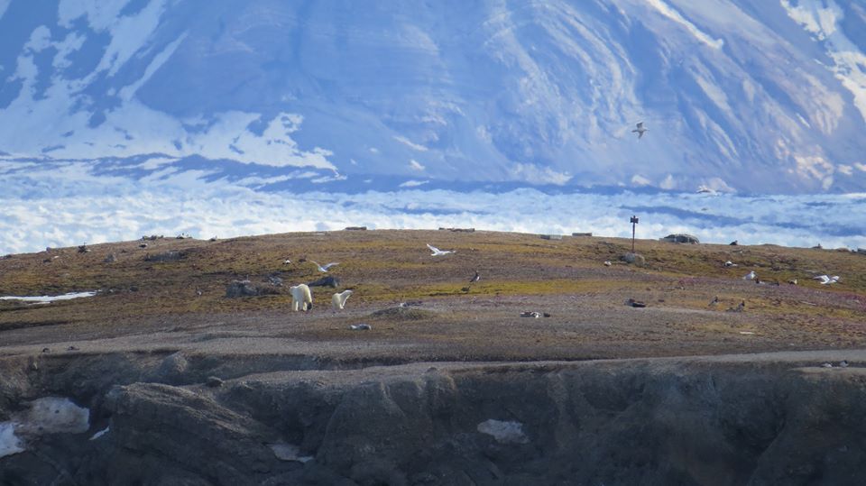 | One day before our arrival, a polar bear female with cub shows up on Prins Heinrichsøya. I wonder how many nests were eaten. | |
