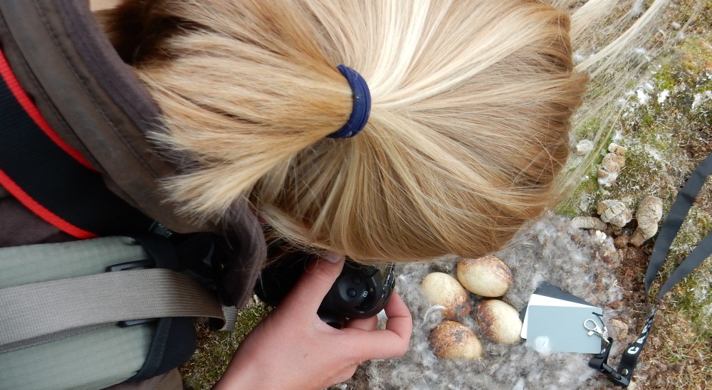 | Margje checks and photographs the nests, maarten made these pictures. Note the typical cloud ceiling. |