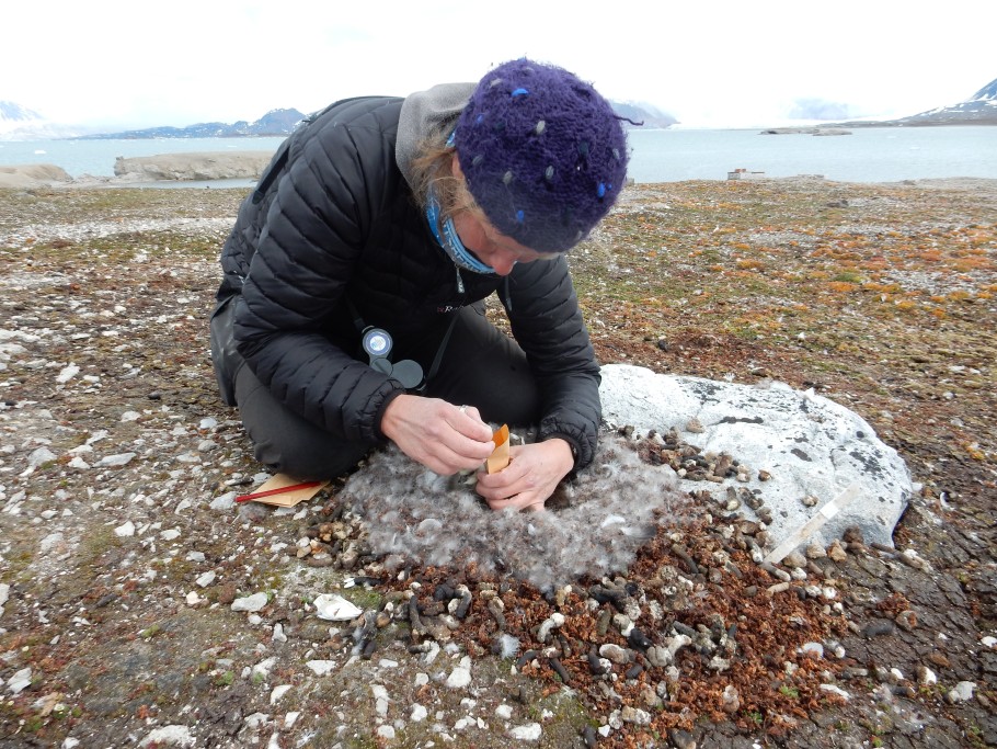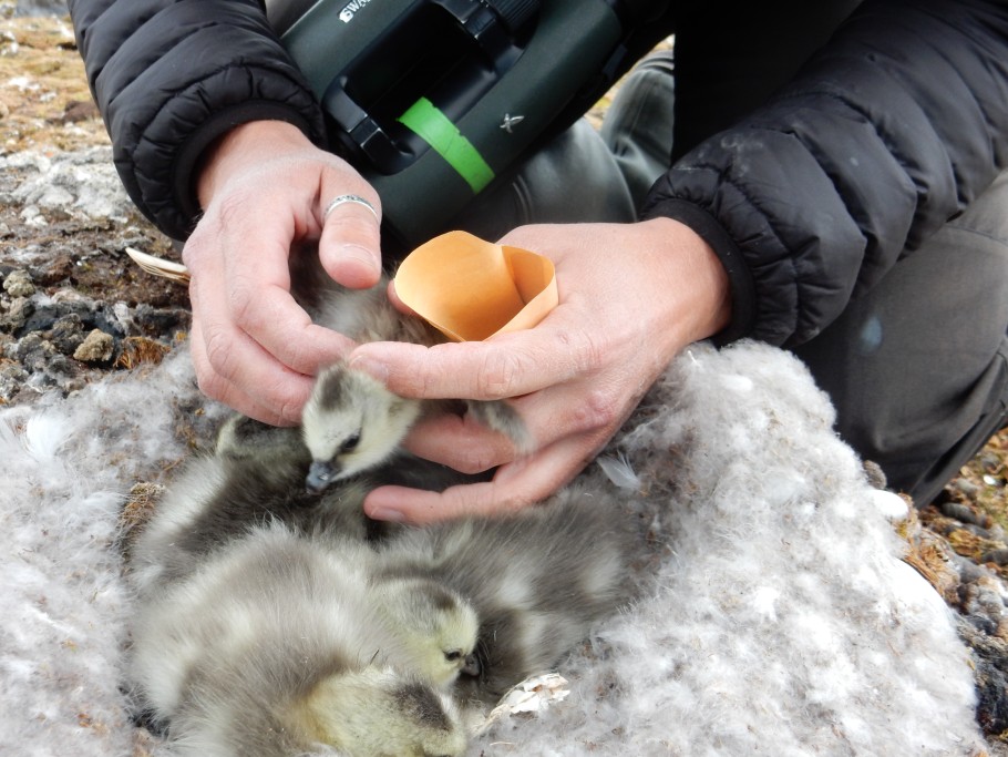 | Suzanne Lubbe verzamelt enkele donsveertjes van kuikens om vast te stellen waar de moeders de voedingsstoffen voor de eieren hebben verzameld. Door te kijken naar de isotopensamenstelling hopen we er achter te komen of de eieren zijn gebouwd tijdens de trek of op de toendra. | |