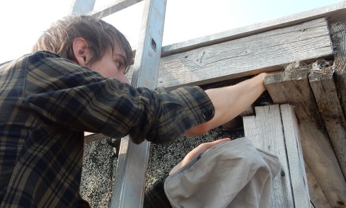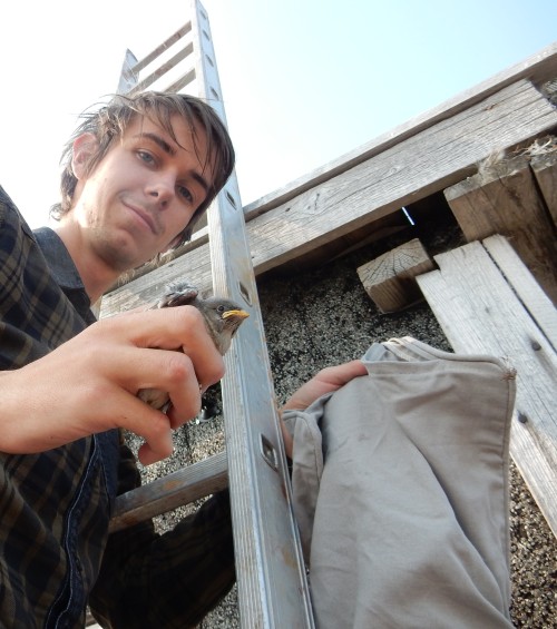 | After seeing an unringed family of snowbuntings on the tundra, I decide not to take any risk. We are ringing the family in the boat house. Janwillem has small enough hands to grab the young. |