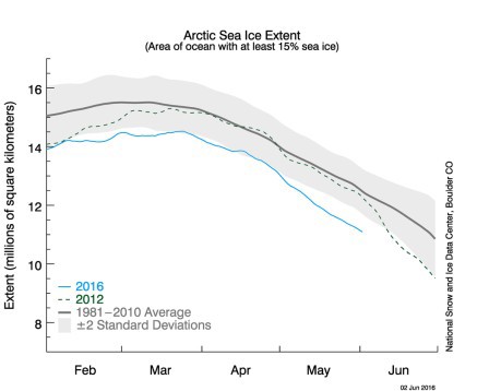 | De dagelijkse stand van zaken van het zeeijs wordt bijgehouden door http://www.nsidc.org. Hier staan twee van hun afbeeldingen van 2 juni 2016. De + is de geografische noordpool. Daaronder ligt Groenland in het grijs. Rechts van de noordpool ligt Spitsbergen. Niet in het ijs, maar in het blauw. De gehele Barentszee is blauw tot aan Nova Zembla. De rode lijn geeft aan wat het vroeger was op deze datum. De grafiek laat zien hoe we weer richting een nieuw record gaan in de ijsbedekking. En mocht dat niet zo zijn, dan wordt het zeker een record in ijsvolume. Want het ijs is veel dunner. | |