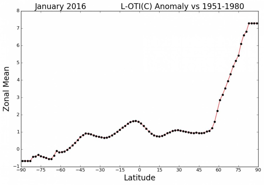| De grafiek hierboven laat het nogmaals zien op een indringende wijze. Over de x-as reis je van links van de zuidpool (-90) via de evenaar (0) naar de noordpool (90) rechts. Als je nu de lijn van de temperatuurtoename volgt, dan was het zuidpoolgebied kouder dan normaal. Het grootste deel van de wereld was 1 graad warmer. Nederland ligt op 53 graden. Ook nog één graad. En dat terwijl we een heerlijk warme januari hadden voll bottende knoppen. Maar dan gebeurt het. De temperatuur is steeds meer toegenomen naarmate je noordelijk komt. Op Spitsbergen was het in januari 2016 7 graden warmer dan normaal. Het is allemaal hetzelfde verhaal. Het ijs smelt, de temperatuur gaat omhoog. Voor ik gisteren naar bed ging keek ik nog even op de website voor de weersverwachting. Daar stond het weer anders geformuleerd. De laatste 66 maanden (5 1/2 jaar) is de temperatuur iedere maand hoger geweest dan de normalen (zie http://www.yr.no voor wie de Noorse taal begrijpt). Toen dacht ik weer aan de grafiek hierboven. Wat betekent dat wel niet voor een trekvogel die naar het noorden vliegt en probeert op het goede moment aan te komen voor het broedseizoen. Ik moet naar buiten. Ik moet gaan meten. Ik moet dit vastleggen. Jammer maar waar. Het zij zo. Nooit meer slapen. | |