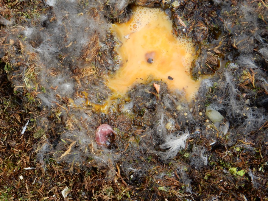 | Ik wist dat rendieren soms eieren aten. Rocky Rockwell had me dat verteld over de sneeuwqganskolonie in La Pérouse Bay. Toen daar een kudde rendieren doorheen liep, waren veel eieren verdwenen. Alleen de embryo's lagen nog in het nest. Op de foto hieronder kun je ook twee embryo's herkennen van ongeveer 10 dagen oud. | |