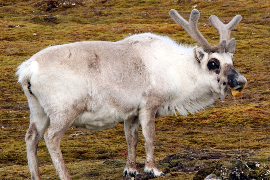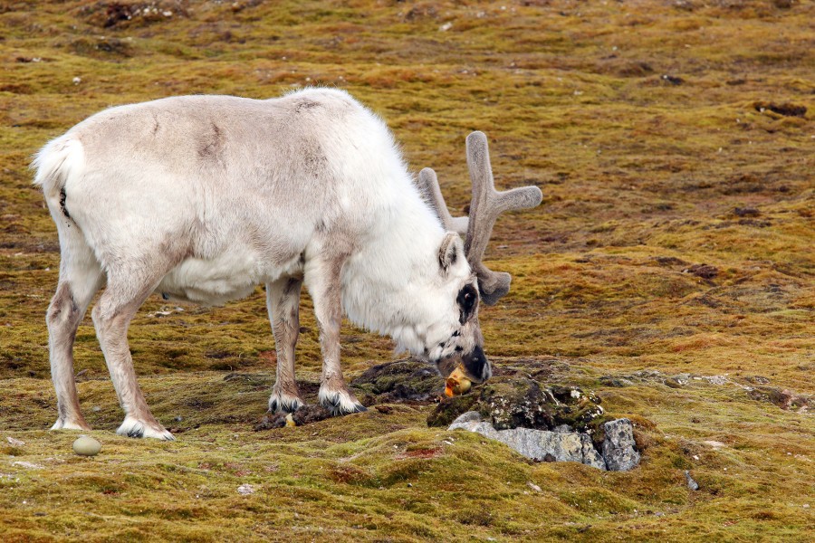 | Later die dag zagen we het nogmaals gebeuren van grotere afstand. De gevolgen zijn duidelijk. Er zijn veel minder eidereendnesten op het eiland dan normaal. De brandganzen doen het wel goed. Die blijken in staat het rendier van hun nest te verjagen. We zagen een mannelijke gans op een rendier afrennen, dat daardoor een paar passen versnelde en weghobbelde. Later zagen we ook een felle interactie waarbij een gans opsprong naar het hoofd van het rendier en het rendier van schrik op de achterpoten ging staan. | |