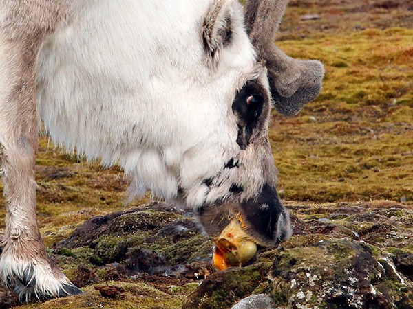 Vandaag zagen we voor de eerste keer dat er een nieuw roofdier op het broedeiland komt. Het is een rendier! Meestal is er in de zomer wel een rendier die daar graast (soms zelfs drie). Ze kunnen 's zomers komen aanzwemmen, dat hebben we ook wel een keer gezien. Maar meestal komen ze 's winters over het ijs en raken opgesloten als het ijs smelt. Als gevolg van het grazende rendier kleurt de toendra er dit jaar nauwelijks paars van de bloeiende Saxifraga oppositifolia. Maar dit jaar deed het rendier iets bijzonders. Voor de eerste keer zagen we de grazer eieren eten van de eidereend. Het rendier was ongeveer 30 meter van ons vandaan, toen we plotseling de eider van het nest zagen vliegen. Het rendier haalde (nogmaals?) met de voorpoot door het nest en een ei rolde er ver uit en twee anderen bleven op de rand liggen. Die twee eieren werden opgegeten. | |