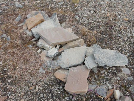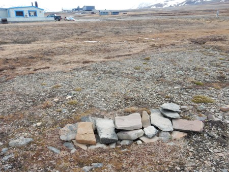 | In Longyearbyen, close to the airport there is an old grave of a whaler. There is still a bone visible between the stones. The buildings on the right picture on the horizon are the airport buildings. We visited the grave on our walk to Bjorndalen after we missed the plane to Ny-Ålesund. | |