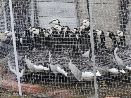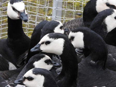 | The first moult catch of the season. We are catching only adult geese without young. That is always a good start and the team can practice all procedures again. Maarten and Willemijn are bringing in a group of 20 geese, which has been put on the water by Margje near the red river. A group of 18 geese joins from the airport cliff beaches. Janwillem is waiting with a canoe in Thiisbulta and Jesse is near the goose catching pen. Margjes return is delayed by a red traffic light near the airport. We need three atempts, 8 geese escape, but we catch 30. A good start. Ringing and measuring is relatively quick, while Margje is testing the stress behaviour of the geese. | |