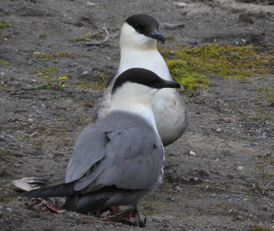Two longtailed skuas are pulling flesh from a carcass of a common eider. They are playing tug of war. Longtailed skuas are relatively rare on Spitsbergen. Ny-London is one of the few places and the birds are very tame. | |