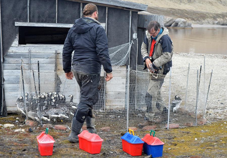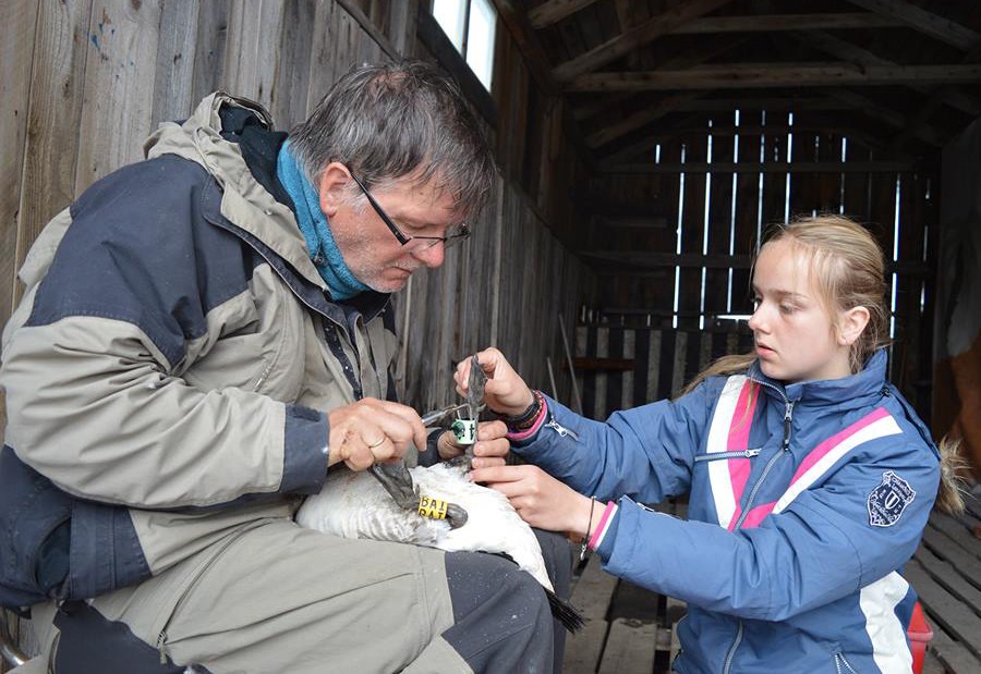 | We doen de ganzen in kleine doosjes, waarin we ze gemakkelijk kunnen wegen en waarin ze rustig zitten totdat ze geringd worden. Vrouwtjes krijgen een geolocator aan een extra riung. Hiermee kunnen we de timing van de trek en het broeden volgen. Willemijn houdt de poot vast. | |