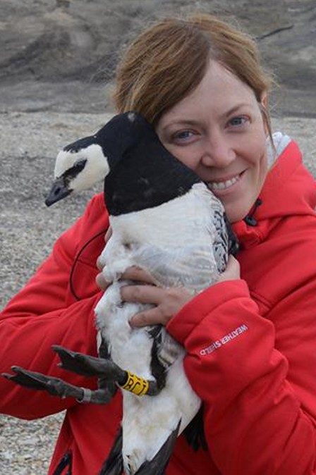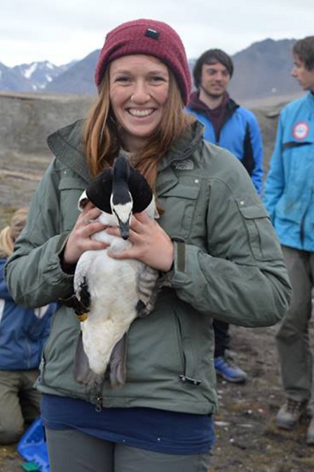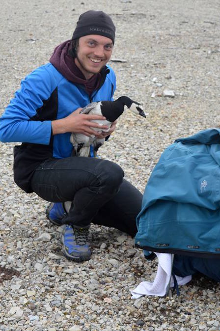 | Dit is de tweede vangst van het seizoen. We vangen weer specifiek een groep zonder kuikens, zodat we de ganzen meteen na het ringen kunnen loslaten. De groep zit steeds aan de mosrand van het meer Solvannet, net naast ons station. We jagen ze het fjord op (waarbij Willemijn even helemaal vastzit in de modder) en brengen ze met kano's en een zodiac naar de vangnetten aan de andere kant van het dorp. Het is een mooie groep van 47 individuen. | |