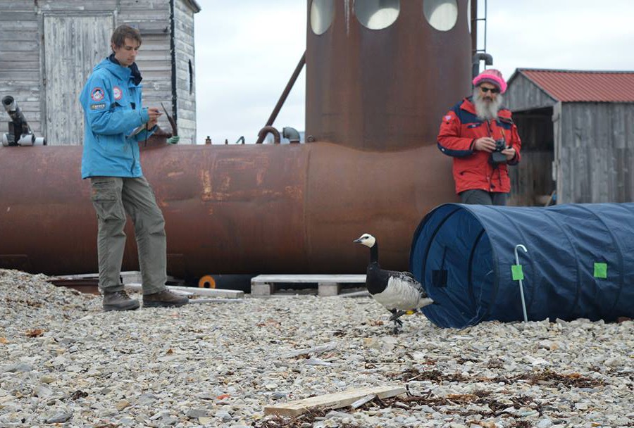 Jesse plaatst de gans aan het begin van een vijf meter lange tunnel en janwillem meet hoe lang het duurt eer de gans zijn vrijheid kiest. Kim Holmén, internationaal directeur van het Noorse Poolinstituut bekijkt de samenwerking en maakt foto's. | |