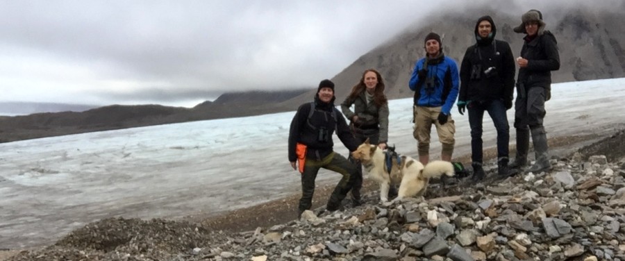 | A last walk organised by jesse. With the dog of Verena, they walk through the morrains to the Mittlere Löwenbreen behind the village. | |