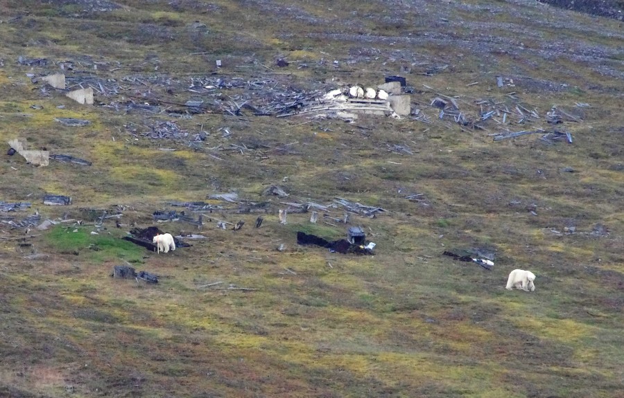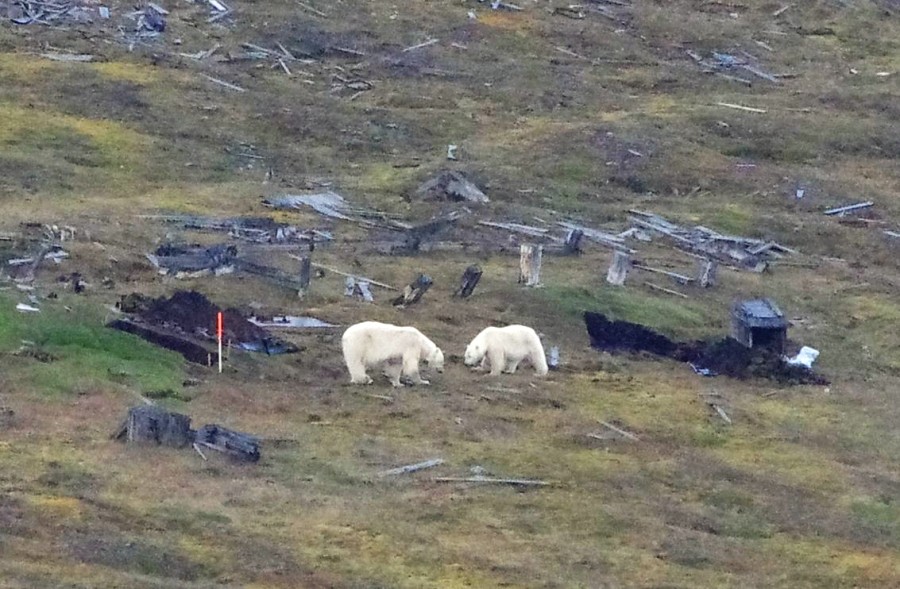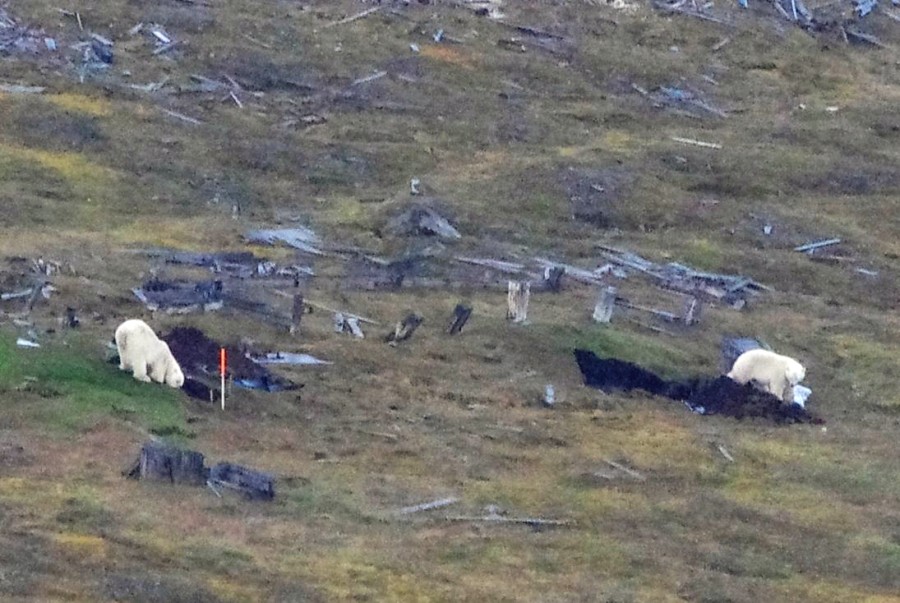 | Members of the Arctic Centre have more and more polar bear encounters on Spitsbergen. In this weblog we have already several bear posts. Jouke Prop even started studying the polar bears visiting his field site. But now the archeologists have made a score. The team of Frigga Kruse, excavating at Advent City (on the other side of the fjord opposite the airport of Longyearbyen) have had two polar bears for several days on their site. Below some pictures. More can be found on their facebook page. | |