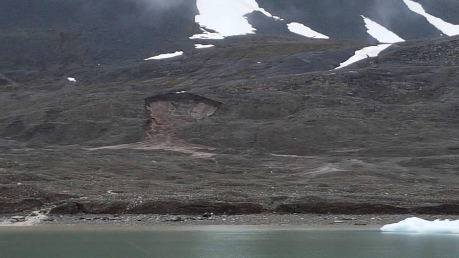 Door de steeds dieper ontdooiende permafrost en meer neerslag, zijn aardverschuivingen een steeds normaler fenomeen in het noordpoolgebied. Deze sporen van een recente aardverschuiving zagen we vlakbij kronebreen tijdens een fjordtelling.