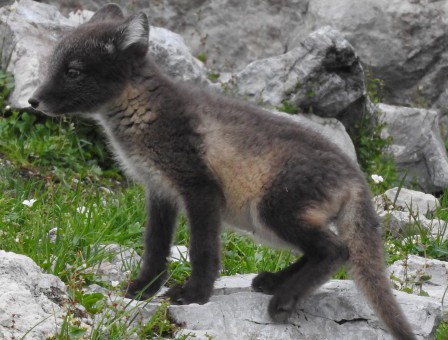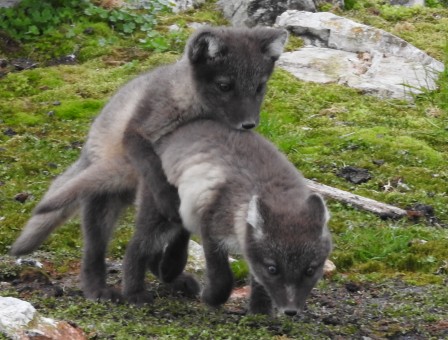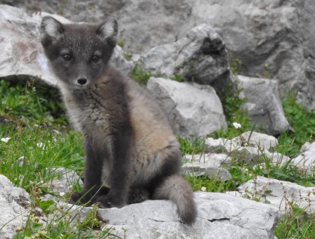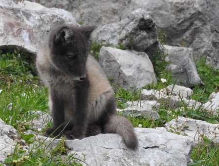 Martine van den Heuvel is having her birtday and this is a good moment to take her team to the kittiwake cliff to see the fox puppies. My motto: a childs joy is a prensent for the mother. We go in our small zodiac and are lucky. | |