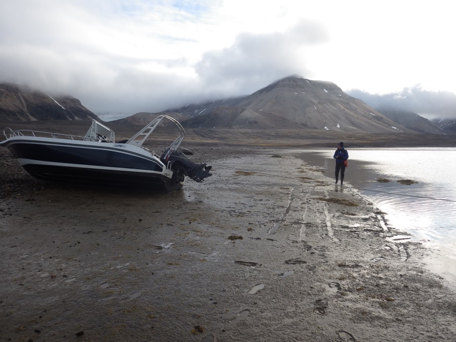 | Every time, we land on a place, we put the boat in between two anchors. You have to judge the tide and we thought we did the right thing looking at the switch from cobbles to sand underwater. Three hours later we return to the boat and find it stranded. The waterline has just passed the boat. However, we have to wait for 4.5 hours before the boat is floating again as it is extreme low tide. | |