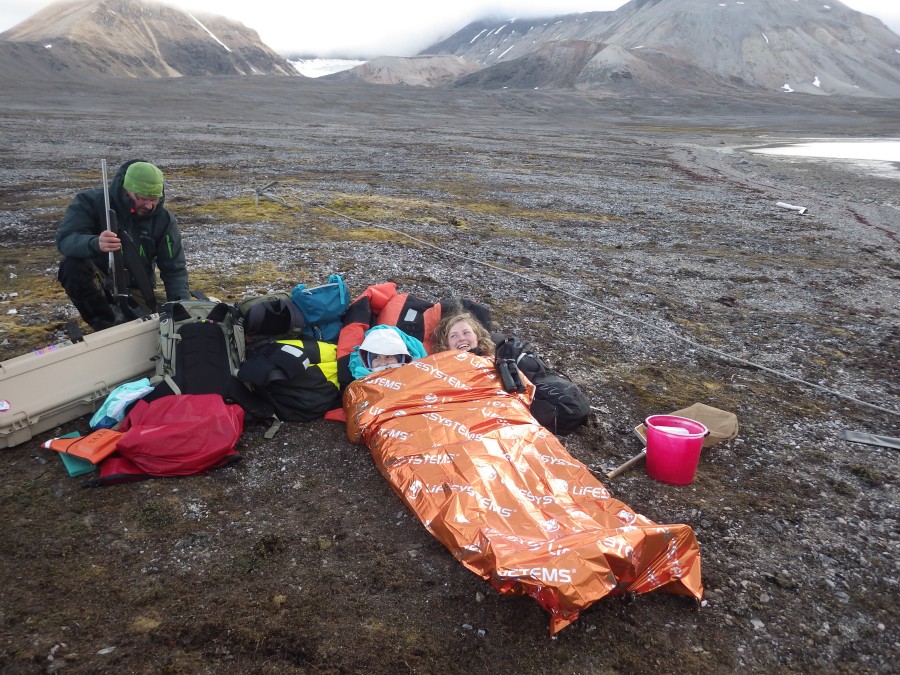 | The lines in the mud were to judge the tide. It went lower and lower. Below Sanne and Mare take a nap in an emergency blanket. Pictures by Yuta Morii. | |