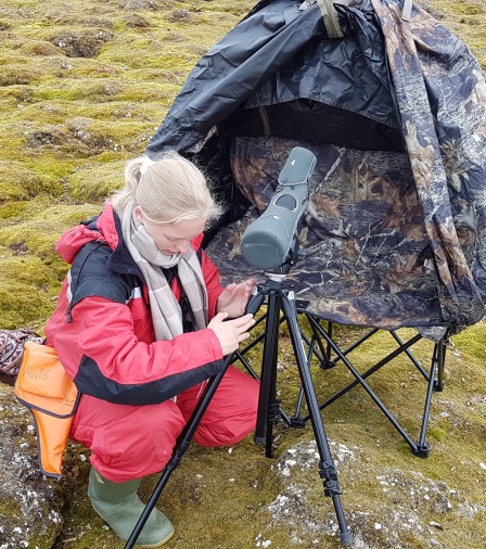| In de middag gaan Mari en ik ringen lezen op Storholmen. Voor het eerst neem ik een nieuwe schuiltent mee. Die werkt prima. Ik zorg dat er honderd ganzen op het strand zitten en Mari leest alle ringen. | |