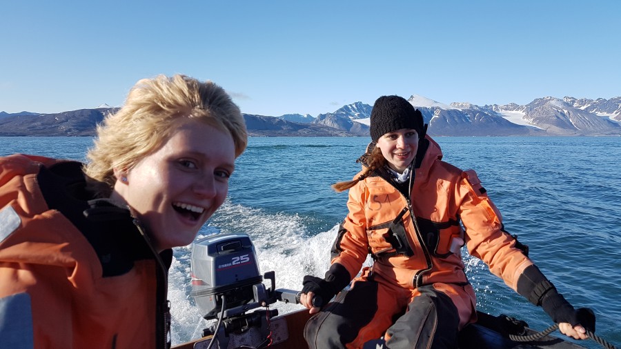 Eefje de Goede en Annabelle de Vries zijn bijna klaar met hun veldwerk. Ze moeten vandaag wel nog kort naar Gasebu en daarna naar Stuphallet. Dat is zoveel lopen, dat ik ze wegbreng met de boot. Vanaf Stuphallet moeten ze dan teruglopen. Het water is kalm, en dit is een mooie gelegenheid om ze voor de eerste keer kennis te laten maken met het varen met een zodiac. Beiden zijn ze aan de beurt en we hebben flink lol. |