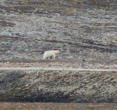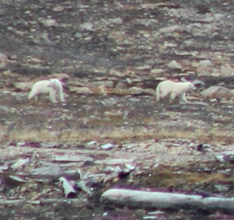 There is a general alarm going through town. The bears seen yesterday in the innerfjord are now passing south of town. A unique chance to observe them from a safe platform on top of the Sverdrup station. Two kids trailing behind their mom, pictures from Marlon de Haan. | |