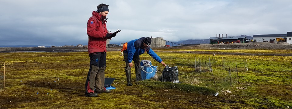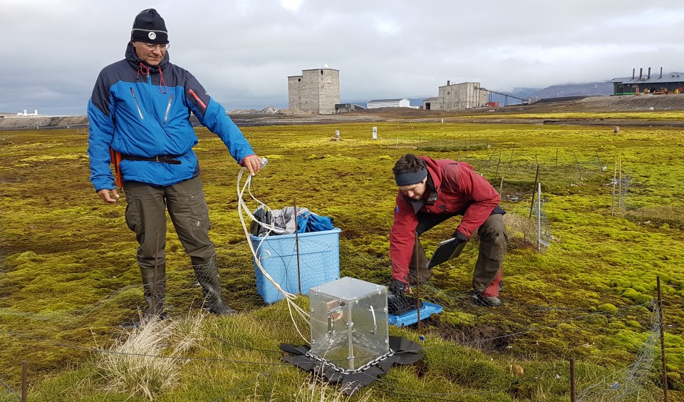 | Matteo Petit Bon is een Italiaan die een promotieonderzoek doet bij UNIS in Longyearbyen aan de effecten van temperatuurverhoging op de vegetatie. Hij is ook betrokken bij het project INSYNC van Brage Bremseth Hansen van NTNU Trondheim. Dat project gaat over vegetatie, ganzen en rendieren en Groningen neemt ook deel aan het project. Matteo is nu hier om het effect van begrazing op de koolstofkringloop te meten. Hij meet hoeveel CO2 wordt ingebouwd als de kamer op de vegetatie licht doorlaat en hoeveel CO2 geconsumeerd wordt als de kamer in het donker is. Eerder heeft Sofie Sjögersten vergelijkbare metingen gedaan in 2006 en kwam tot de conclusie dat het effect van begrazing groter is dan het effect van opwarming van 2 graden Celsius. Armin Eibers helpt hem vandaag met de meting van Kate Layton-Matthews is ziek. | |