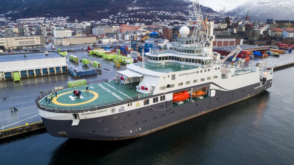 The new vessel RV Kornprins Haakon has arrived in Norway and this autumn she will come to the Arctic. It has icebreaker capacity and is 100 meter long and 21 meter wide. The first project will be the Nansen Legacy and she will study the ice edge of the Arctic. | |