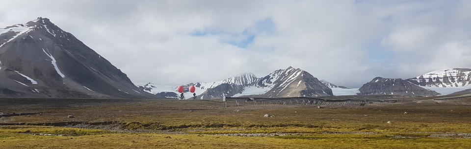 | Eerder gebruikten de onderzoekers uit Leiden blauwe ballonnen om hun multispectrale camera de lucht in te krijgen. Tot nu toe hebben ze alle 8 blauwe ballonnen verbruikt. gelukkig vonden ze extra ballonnen bij AWIPEV. Nu is de kleur rood. | |