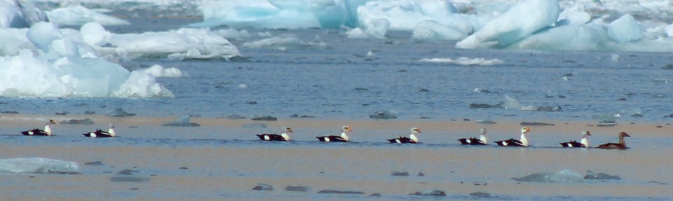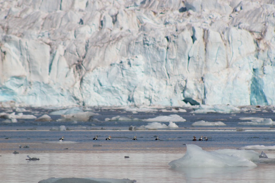 Tijdens de fjordcount kwamen we koningseiders tegen tussen het ijs bij de gletsjer. Deze soort zien we niet zo vaak in het fjord en zeker niet zo laat in het seizoen.